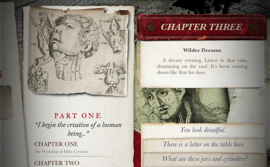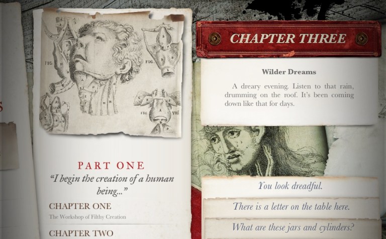 Another company, Inkle put out a new version of Frankenstein last year to great acclaim. It applied this same ‘choose your own adventure’ idea to Mary Shelley’s classic. Although you still read the book in traditional chapters, it is no longer presented as a piece of prose. Author Dave Morris has re-written the text as a conversation between the reader and Victor Frankenstein. It’s a hugely effective device – and one I imagine would hook a young audience who might find Shelley’s dense prose a little off-putting.