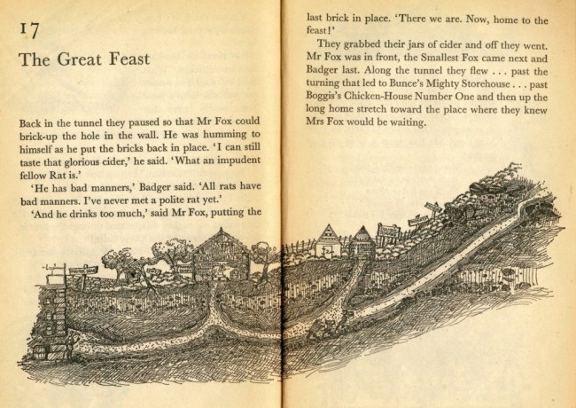 Obviously every great children’s book needs a map of some description. In Fantastic Mr Fox we have something better – wonderful cross sections of the tunnel between the Fox hole and the farmers’ store rooms.