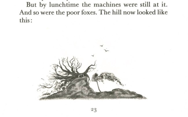 In Dahl’s own Caedmon audiobook reading of Fantastic Mr Fox, he verbalises the condition of the hill at each stage of the race between the foxes and the nasty farmers. He describes the first pictures as “In the beginning, the hill looked like it always used to look” and continues with “After about an hour…one half of the entire hill had disappeared.” By lunchtime, “the hill had now completely disappeared”. The last picture is described thus: “By five o’clock in the afternoon, in the place where the hill had once been, there was now an enormous deep hole. It was like the crater of a volcano…”. Rather than rely on our own interpretations of the pictures, we can take guidance from Dahl’s own reading.