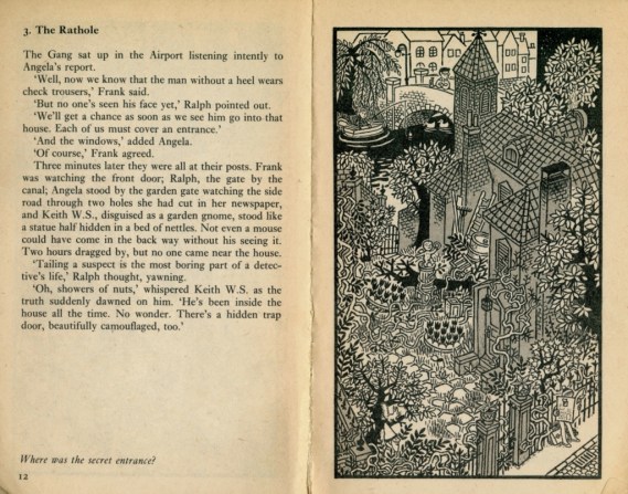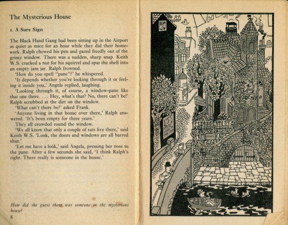 The Black Hand Gang are a group of children (and a squirrel) running a detective agency from their bedroom. The first case sees them exploring a mysterious dark house, and uncovering a forgery business operating out of the basement.