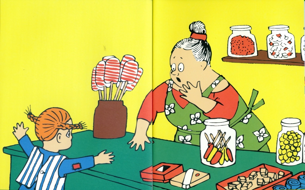 My favourite story here is Pippi goes Shopping, a piece of wild, wish fulfilment that I’m sure every child has at least three times a week – a suitcase full of gold coins and the run of the shops.