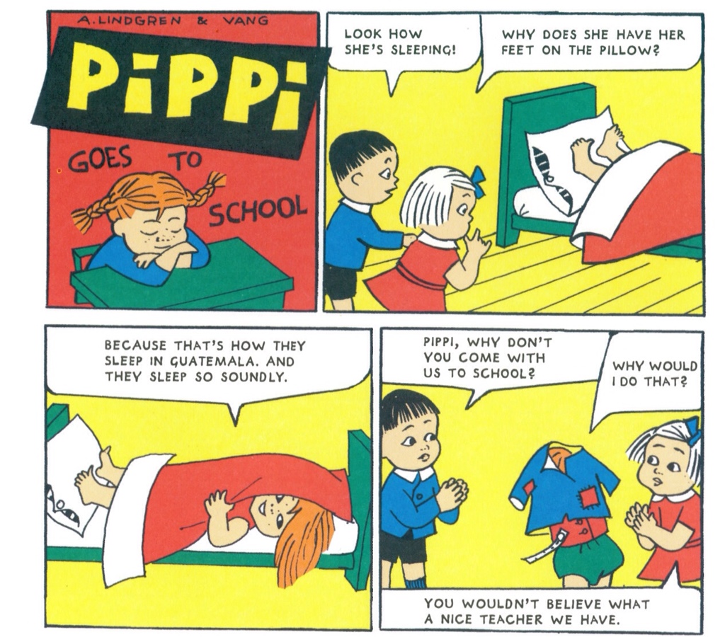 Then a reprint of the 1958 Pippi Longstocking comics dropped through my letterbox and showed exactly why I wasn’t connecting with their work. The illustrations here are by the original artist, Ingrid Vang Nyman. With just one glance it becomes clear, Vang Nyman owns Pippi Longstocking. Her version defies reinterpretation.