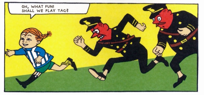 Vang Nyman’s Pippi might be pushing 60, but in this vivid adaptation her odd stockinged feet come leaping off the pillow. Publishers Drawn & Quarterly have done a bang up restoration job making the most of the limited colour pallette of blue, red, yellow, green and (of course) orange. The ink looks as if it’s barely had time to dry, it’s that fresh.