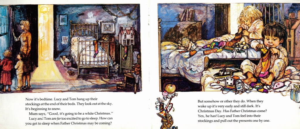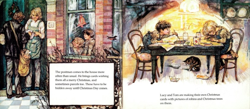 I grew up with Lucy and Tom in the late Seventies and early Eighties, so revisiting the book now feels rather like looking at my own childhood Christmases, laid out in lovely thick gouache. It’s all there; the rolling out of the pastry for mince pies; the Sally Army parping away at the end of the street; the frantic unpacking of stockings at the foot of the bed.