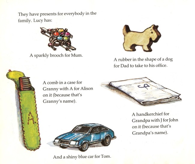 The page where we see the presents that Lucy and Tom have both bought for their families raised a particular chuckle of recognition. A rubber in the shape of a dog and a ‘smart bow-tie on elastic’ for dad, a ‘comb in a case for Granny with A for Alison on it (because that’s Granny’s name)’ and best of all ‘a pen for Lucy which changes into different colours’. This is exactly the sort of lovely tat that I would have gathered for my family.