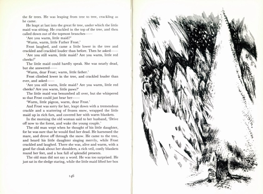 This version sees the wicked step mother trying to kill off her hated step daughter Martha, by dumping her in the middle of the forest. In the night Martha is visited by Frost, the embodiment of winter, who acts like a kind of hardcore Father Christmas. Martha charms him and is rewarded with furs. On her safe return the stepmother is enraged by her ‘marriage’ to Frost and sends her own daughters out to seek their reward. But the sisters are rude and charmless, and are discovered the next morning dead, ‘with their anger still to be seen on their frozen ugly faces.’ Cracking stuff. I might start using Frost as a seasonal threat with my children.