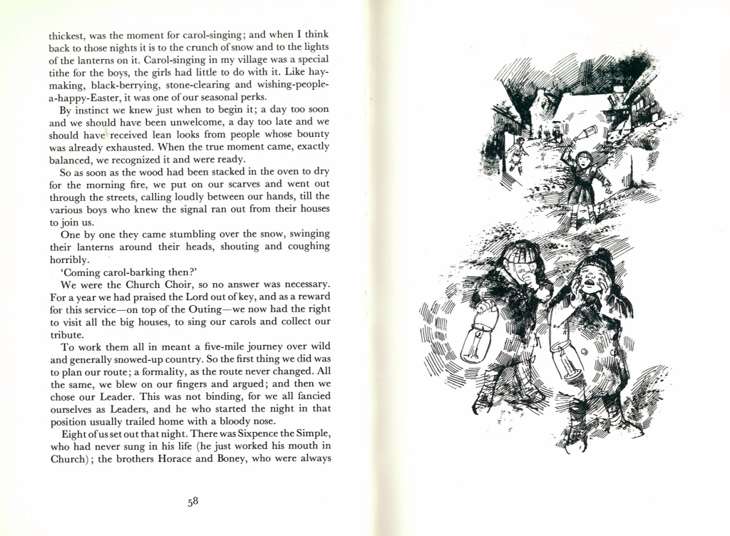 Laurie Lee provides Carols in Gloucestershire from his autobiographical Cider with Rosie. The scene he sets is the same one that launched a thousand phoney Christmas films, ‘Later towards Christmas there was heavy snow, which raised the roads to the top of the hedges. There were millions of tons of the lovely stuff, plastic, pure, all-purpose, which nobody owned, which one could carve or tunnel, eat, or just throw about.’ His village is cut off from the rest of the world, but nobody seems to mind. Lee and his friends to go off carolling, connecting back to the first Noël.
