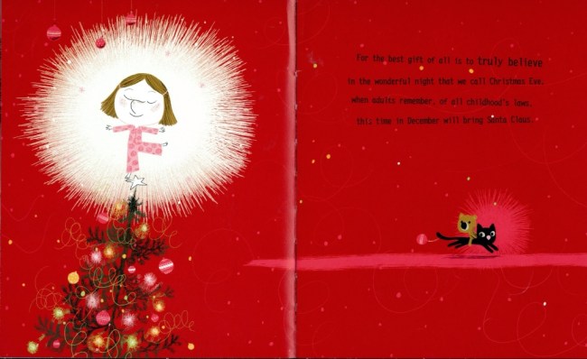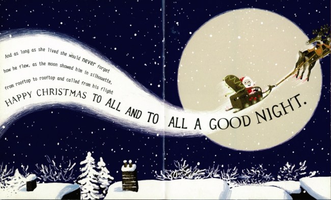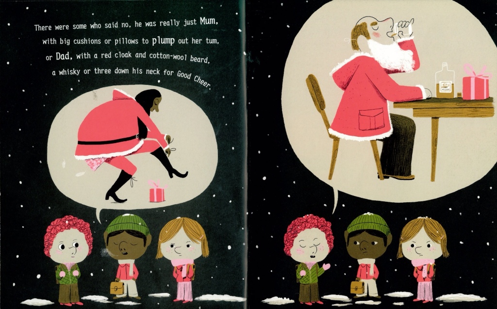 What Duffy has done is bring this Christmas confection into the same place inhabited by Raymond Briggs’ Father Christmas. It has a recognisably British sensibility, ‘But the child who was up and long out of her bed, saw no visions of sugar plums dance in her head; she planned to discover, for once and for all if Santa Claus (or Father Christmas) was real‘.
