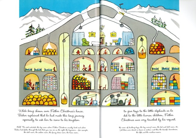 Accompanied by a dog called Duck, who claims to have a good nose for sniffing out the mythical present giver, they are accosted by a band of snow flinging gnomes, who turn out to be Santa’s helpers. It is they, not the elves who run his underground lair (another great example of the Christmas cross-section). The Babar books come in for a lot of flak for their pro- Empire stance, this website offers an interesting reading of Father Christmas’s workhouse.