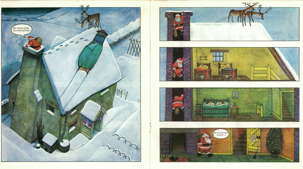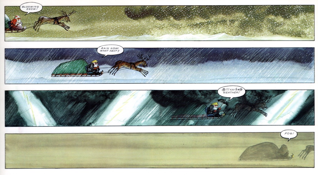 Now correct me if I’m wrong but that would make Father Christmas the first English language ‘graphic novel’. It was certainly the book that introduced me to the wonder of comics. Briggs used the form brilliantly, realising the full cinematic impact, particulalry in the scenes when Father Christmas flies his sleigh through all weathers.