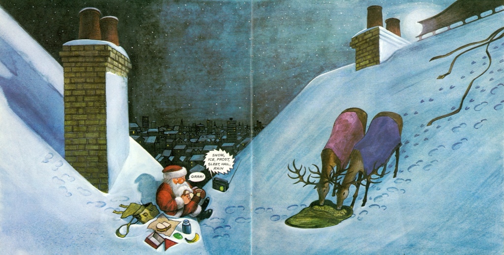 ‘I saw him partly in terms of my father, because he was a milkman. In those days it was sooty and dirty because everyone had coal fires and he used to get filthy doing the job – I used to help him a lot when i was a kid. Your hands used to get really black.’ It was a reaction to what Nicolette Jones describes in her biography Blooming Books as ‘the regal Santas enthroned in glittering palaces and the factory owners with a staff of elves.’