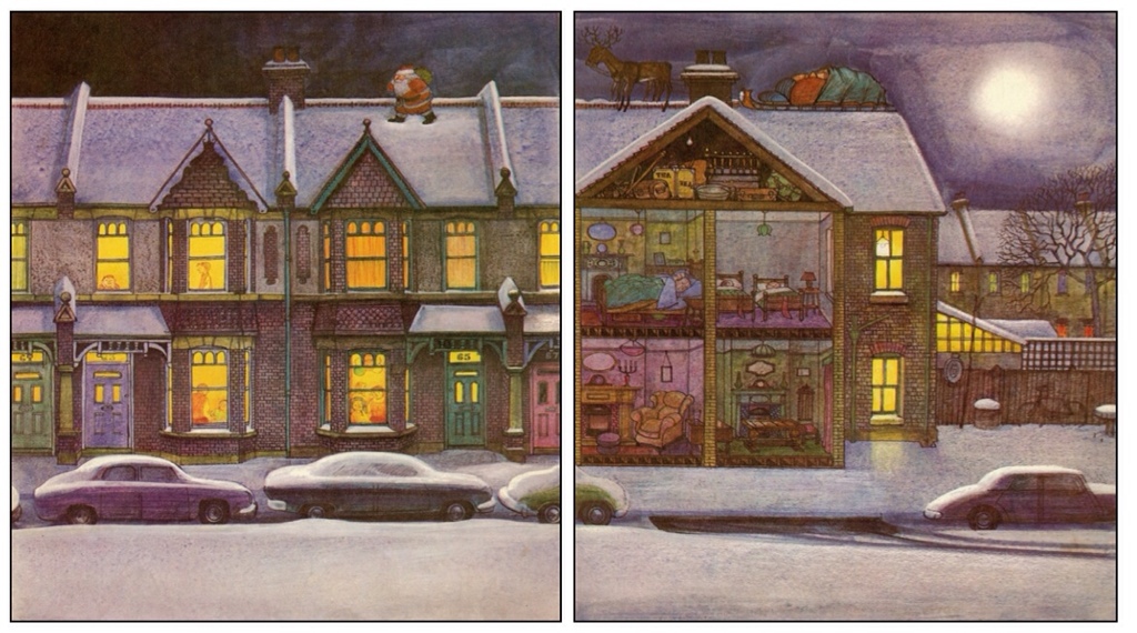 I imagine what really appealed to me as a child was the fact that Briggs used a recognisably British setting. Father Christmas visits Raymond Briggs’ real home near Ditchling, Sussex, as Nicolette Jones writes ‘the layout of which is accurately reproduced in the book, down to the picture window looking from the living room onto the back garden and split stable door at the front’.