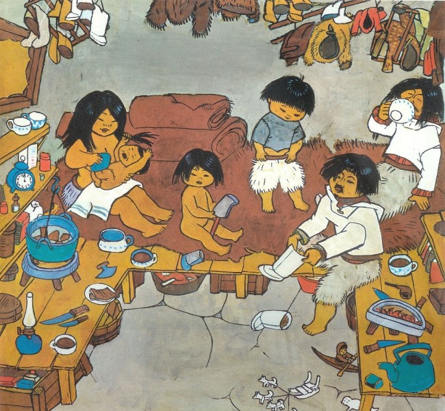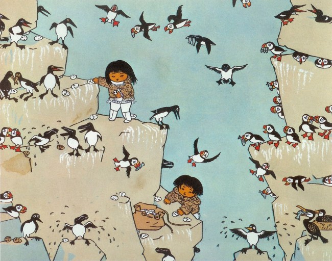 Having completed the first Pippi Lognstocking book in 1945, illustrator Ingrid Vang Nyman teamed up with her cousin Pipaluk Freuchen to create Ivik the Fatherless, later published in the UK as Eskimo Boy. Pipaluk was the half Inuit daughter of Ingrid’s uncle, the famous Arctic explorer Peter Freuchen (surely the inspiration for Pippi’s pirate father). Until the age of 12 she was raised among the Greenland Inuit at Thule, one of the world’s most northernmost towns.