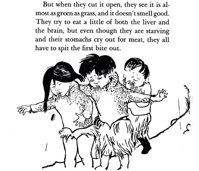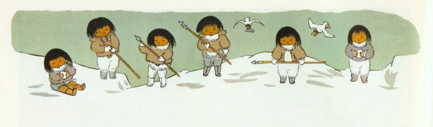 Peter had already written a number of books on the lives of the Inuit, which were adapted into the gritty MGM movie Eskimo in 1933 (in which he also starred). Although writing for a younger audience than her father, Pipaluk also remained true to the harsh existence of the Inuit people. The book has an almost documentary feel, its stories read as if they’ve been written word for word from first hand accounts. It’s shockingly vivid for a children’s book. In the opening chapter Ivik sets out full of pride on his first hunting expedition with his father.
