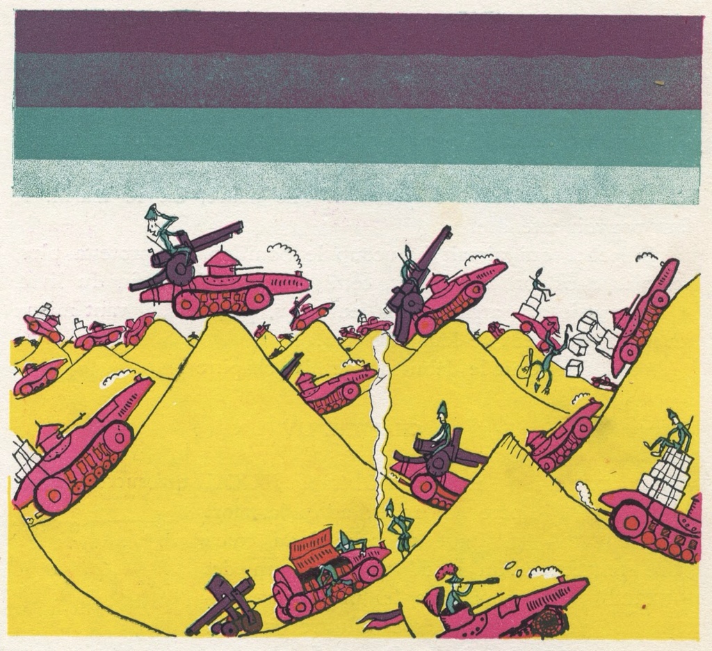 Bruller’s drawings are at their best when dealing with the details of the military machine. We see the differences between trench design, an idea the Fattypuffs adopt from Maurice’s tales of the Great War. However the Fattypuffs are unable to fit into standard narrow trenches, so they devise ‘a sort of globular trench, narrow at the top and rounded at the sides’ to house their waists, but protect their necks.