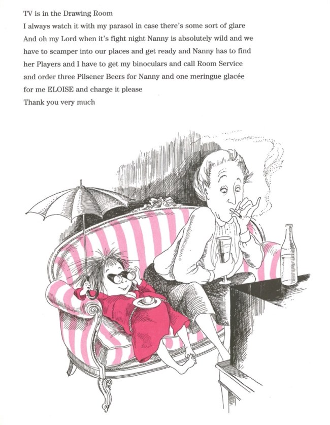 But her best relationship is with her 'mostly companion' Nanny. Although English she is not the type of stereotyped Brit you might expect from such an American book. She may be a stuffed shirt, 'She wears tissue paper in her dress and you can hear it', but she is also a jolly good egg, with a penchant for John Player cigs, Pilsner lager and a good bout of boxing – which Eloise watches under a parasol and through theatre glasses.