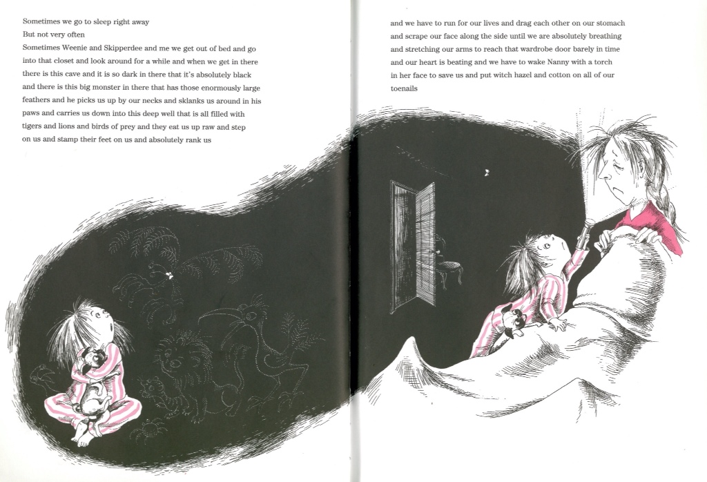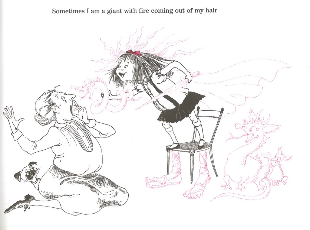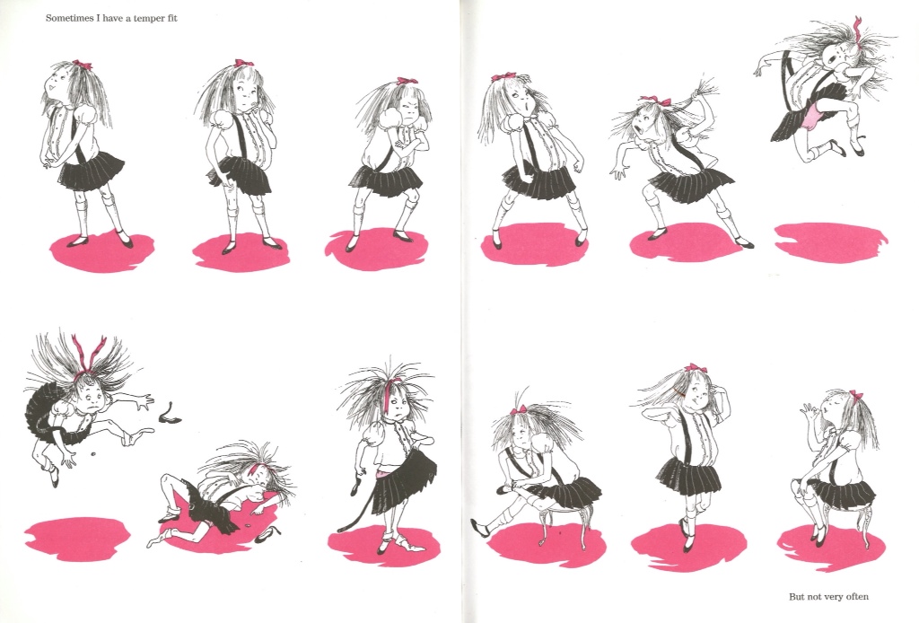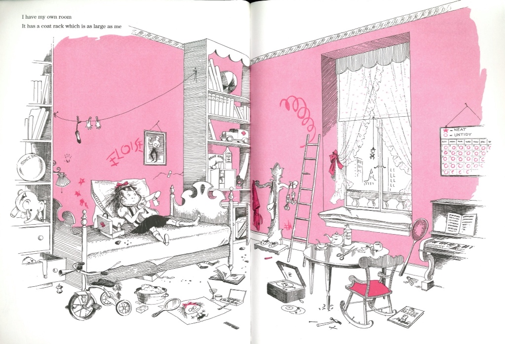 Described by Maurice Sendak as, ‘that brazen loose-limbed delicious little girl monster’, Eloise is a wild thing to match her contemporary Max. Like him she lives amongst giants who indulge her bad behaviour. There is no hint that the lack of parental discipline will spoil her in any way. Just the opposite, it greases the wheels of her imagination and helps defines her.