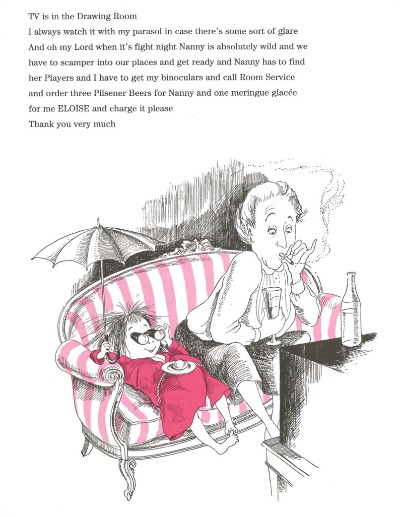 But her best relationship is with her 'mostly companion' Nanny. Although English she is not the type of stereotyped Brit you might expect from such an American book. She may be a stuffed shirt, 'She wears tissue paper in her dress and you can hear it', but she is also a jolly good egg, with a penchant for John Player cigs, Pilsner lager and a good bout of boxing – which Eloise watches under a parasol and through theatre glasses.