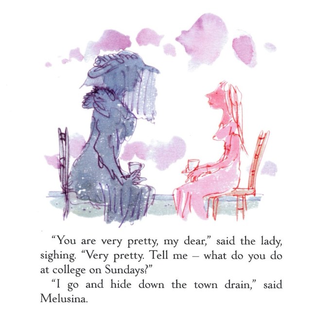 In Melusina Aiken tackles the well-worn story of a capricious Queen who curses an unfortunate baby. ‘Once a week every Sunday, that person will turn into a pink snake… And in between times, the person will hiccup every time they eat an apple. And her tights will always ladder. And her nail polish will peel. And her lipstick will smear. And she will lose her rail-pass and her contact lenses will fall out. And she will marry a skeleton. And -‘
