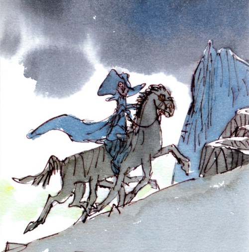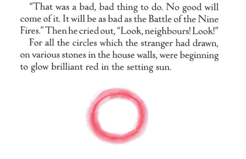 The book builds to a trio of stories for which Quentin Blake produces some of his finest work and which immediately jumped out at him when asked to supply some sample drawings. ‘I had no difficulty in knowing which ones I wanted to try. First of all there was the horse with the eight legs and its sinister one-eyed rider galloping up the mountain track.’ This story, Furious Hill sees the mysterious stranger ride into the town where his father died. He sets up a stall healing the townsfolk and in return asks them about his father’s dying words. The story is perplexing and enchanting in equal measure, ending with a simple image of a glowing red circle that gave me chills.