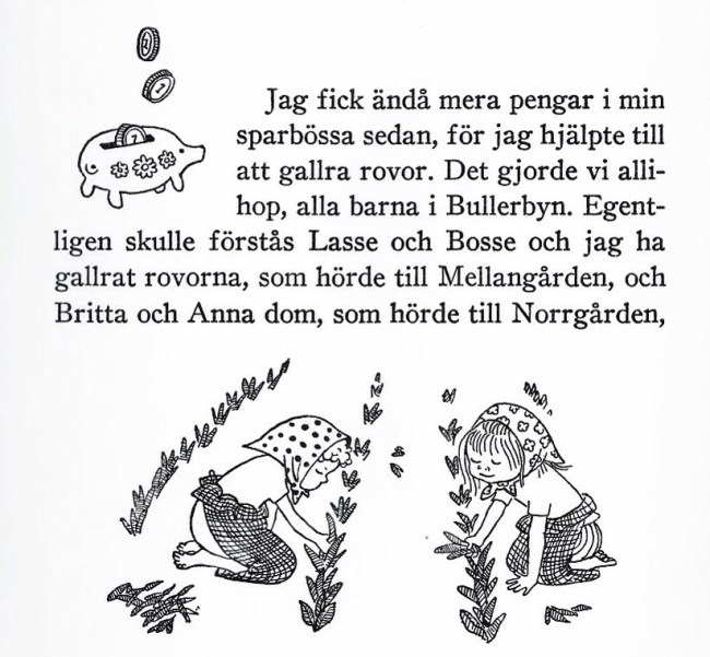 This comment makes it sound as though there might be a sadness in Lindgren’s writing. Quite the opposite, her task is to make Bullerby as vivid and lively as possible. Her childhood lives forever, as the final lines from the story Crayfishing at Nocken make clear, ‘The sun was shining on the windows of the houses, and they looked beautiful.