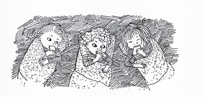 There are great tracts where nothing really happens. For example when Anna visits her grandfather you think we might be about to meet a twinkly old timer, like Charlie’s Grandpa Joe. Not a bit of it, this guy definitely has one foot in the grave, ‘His eyes are so weak he can hardly see anything.’ So Lisa, Britta and Anna read the newspaper to Grandfather as he chills in a rocking chair, adverts, death notices and all. The best part of his day he says is ‘cuddling down in my bed. I feel very tired.’ But for all that, the scene is full of charm – the children’s interactions with adults reminding me of Dorothy Edwards’ Naughty Little Sister books.