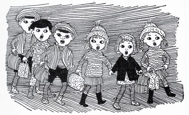 These partly autobiographical stories come from a place that’s a Swedish equivalent of Arthur Ransome’s England, long lost but still vivd and yearned for in the popular imagination. In Ransome’s stories play leads to adventure and intrigue, but for Astrid Lindgren the play is quite enough by itself. Whether they are ‘crayfishing in Nocken, dipping the pot at Christmastime or nutting for the New Year’, the everyday activities of the Bullerby children sound to the modern (adult) British reader both nostalgic and quite exotic.