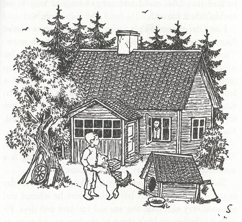 The adventures, such as they are, stay rooted in the everyday but take on a fairy tale quality. In one story only child Olle gets a new dog. The animal belongs to a shoemaker called Mr. Kind (by name, not nature). He’s an archetype right out of Grimm, what with his shoe mending, being fearsome and living in a cottage in the forest. But Mr. Kind isn’t harbouring any enchanted princesses or anything, just a mistreated dog, who Olle befriends and eventually buys off the horrible old man.