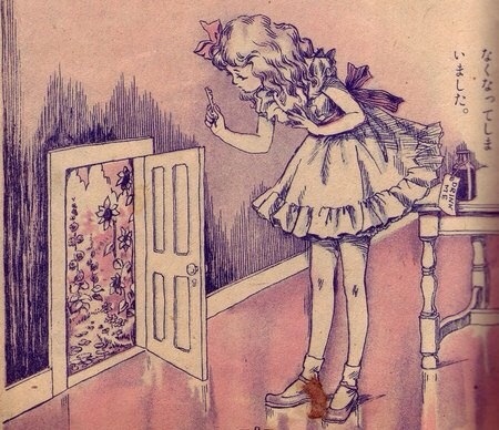 Alice opened the door and found that it led into a small passage, not much larger than a rat-hole; she knelt down and looked along the passage into the loveliest garden you ever saw. How she longed to get out of that dark hall and wander about among those beds of bright flowers and those cool fountains, but she could not even get her head through the doorway. “Oh,” said Alice, “how I wish I could shut up like a telescope! I think I could, if I only knew how to begin.”