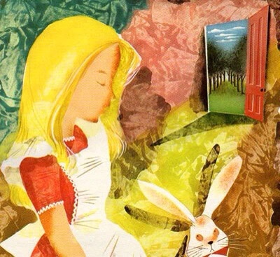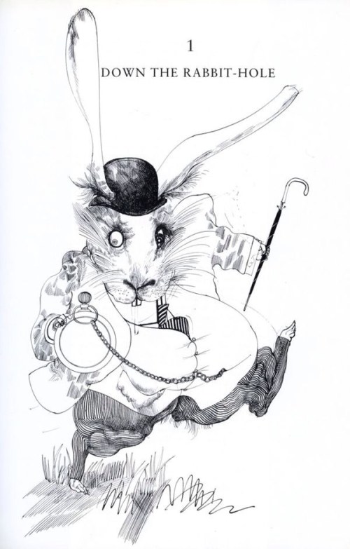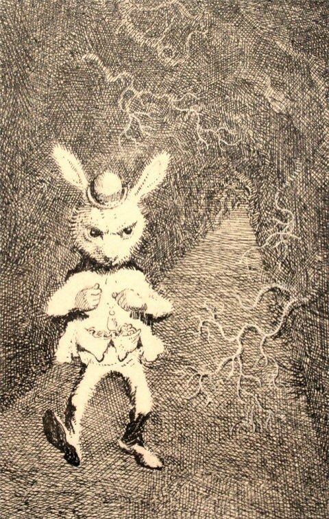 There was nothing so very remarkable in that, nor did Alice think it so very much out of the way to hear the Rabbit say to itself, “Oh dear! Oh dear! I shall be too late!” But when the Rabbit actually took a watch out of its waistcoat-pocket and looked at it and then hurried on, Alice started to her feet, for it flashed across her mind that she had never before seen a rabbit with either a waistcoat-pocket, or a watch to take out of it, and, burning with curiosity, she ran across the field after it and was just in time to see it pop down a large rabbit-hole, under the hedge. In another moment, down went Alice after it!
