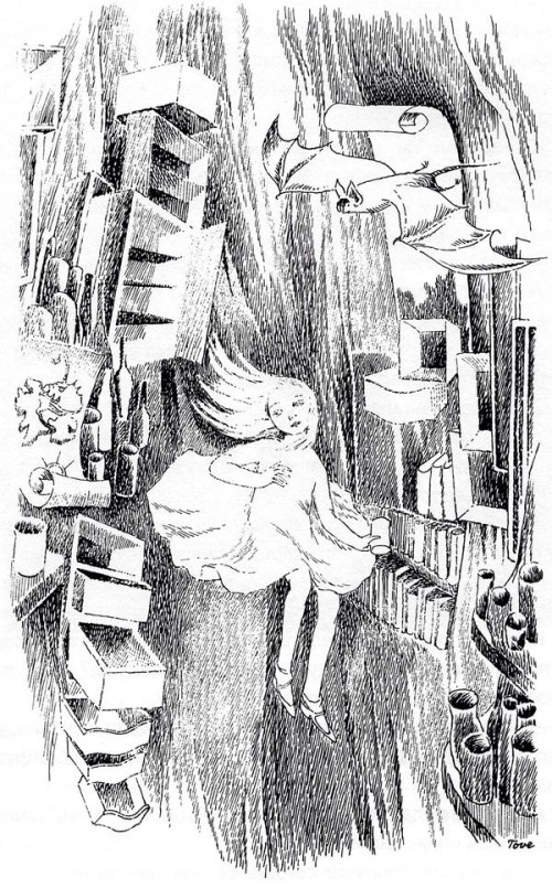 Either the well was very deep, or she fell very slowly, for she had plenty of time, as she went down, to look about her. First, she tried to make out what she was coming to, but it was too dark to see anything; then she looked at the sides of the well and noticed that they were filled with cupboards and book-shelves; here and there she saw maps and pictures hung upon pegs.