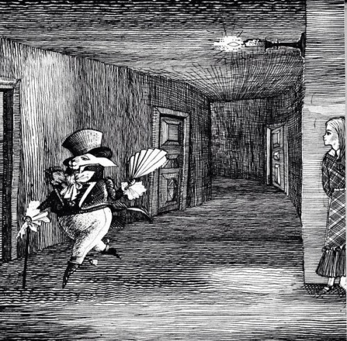 She found herself in a long, low hall, which was lit up by a row of lamps hanging from the roof. There were doors all ’round the hall, but they were all locked; and when Alice had been all the way down one side and up the other, trying every door, she walked sadly down the middle, wondering how she was ever to get out again.