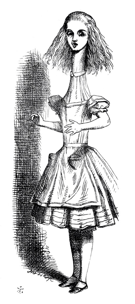 Alice went back to the table, half hoping she might find another key on it, or at any rate, a book of rules for shutting people up like telescopes. This time she found a little bottle on it (“which certainly was not here before,” said Alice), and tied ’round the neck of the bottle was a paper label, with the words “DRINK ME” beautifully printed on it in large letters.
