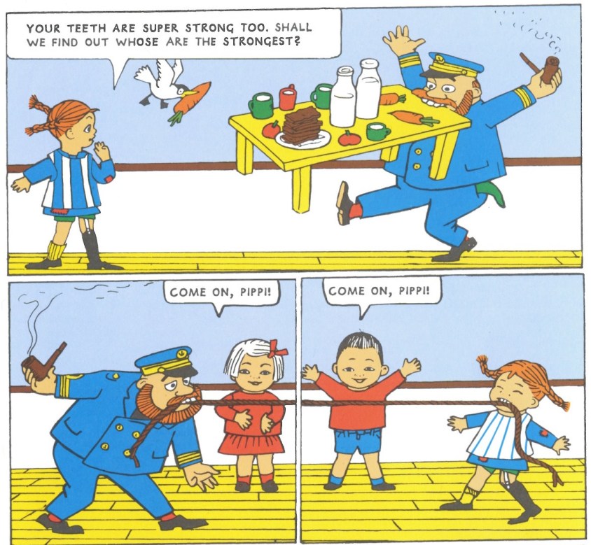 What we have here is the essence of Pippi Longstocking. The wonderfully rambling adventures of the pigtailed pirate princess are stripped of every bit of extraneous detail, and supporting characters. And although we lose many of Pippi’s barmy ramblings, it’s a testament to the strength of Lindgren’s original stories and Ingrid Vang Nyman’s abilities as an artist who can both capture character and make neat narrative leaps through deceptively simple illustration.