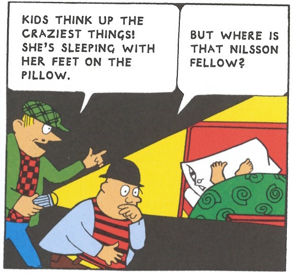 You get a blast of this as soon as you open the book. Shorn of the original speech bubble (‘Can you tell me if there’s a Spoonk in here?’), we’re left with a scene showing Pippi peering through the open window of some middle class salon, where two rather proper ladies are enjoying tea (or probably coffee) and cake.