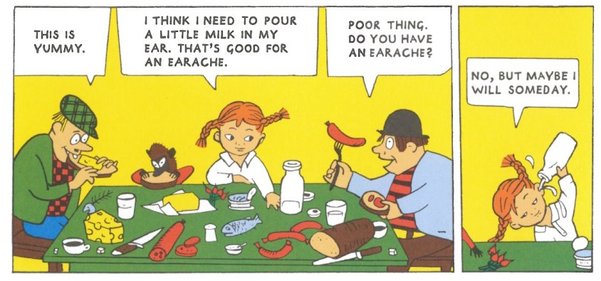 Among the stories featured is one of my favourites, Pippi and the Burglars. It’s got all your favourite elements within it; a big case of gold coins, two foolish burglars, a monkey in a doll’s bed and an unexpected ending in which Pippi demonstrates her absolute control over these ragged robbers by inviting them to a tea of sausages and cheese. She then pours milk in her ear – just in case she has earache at some point in the future.