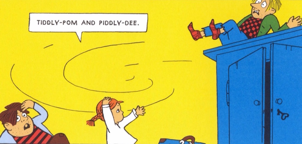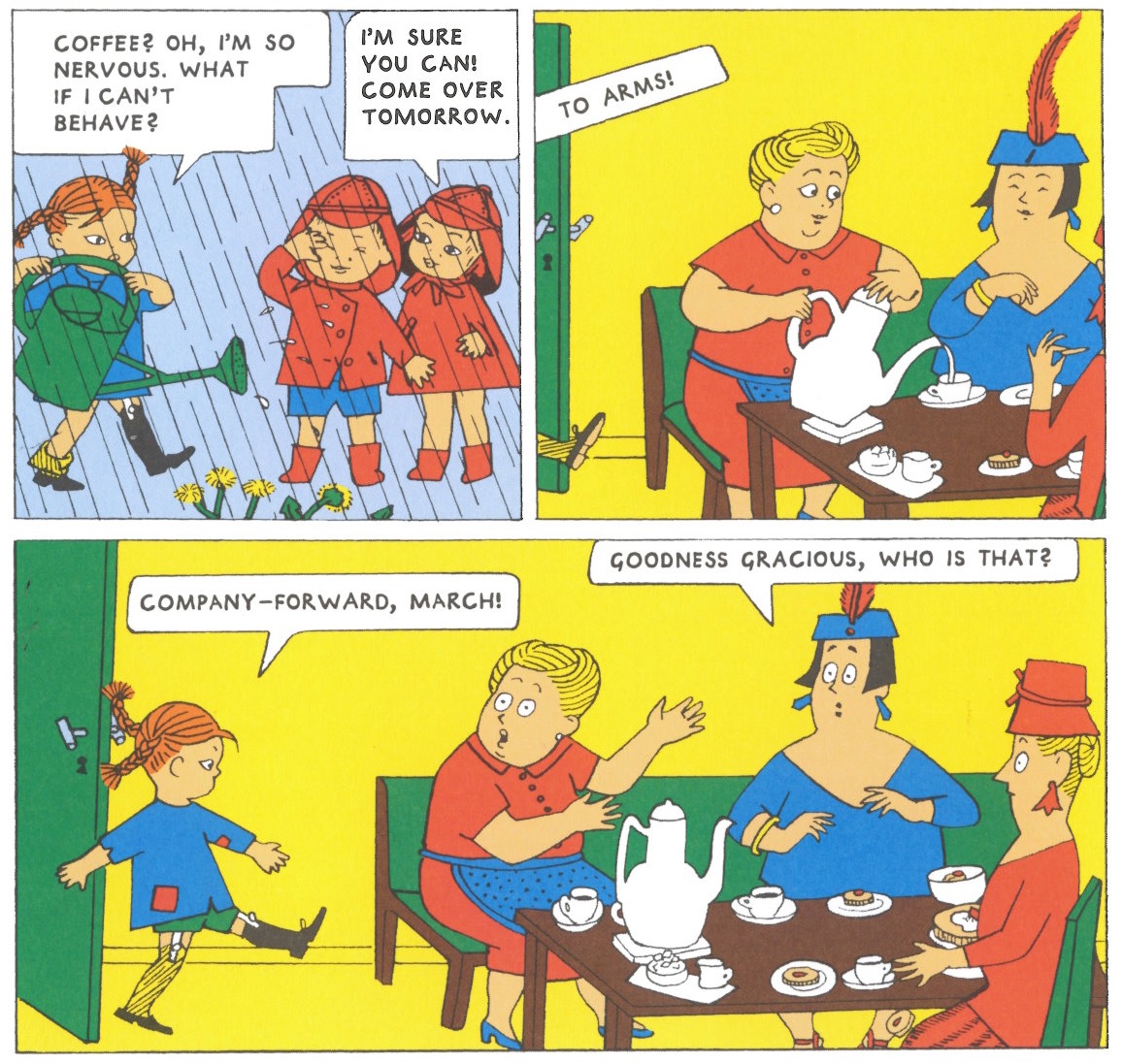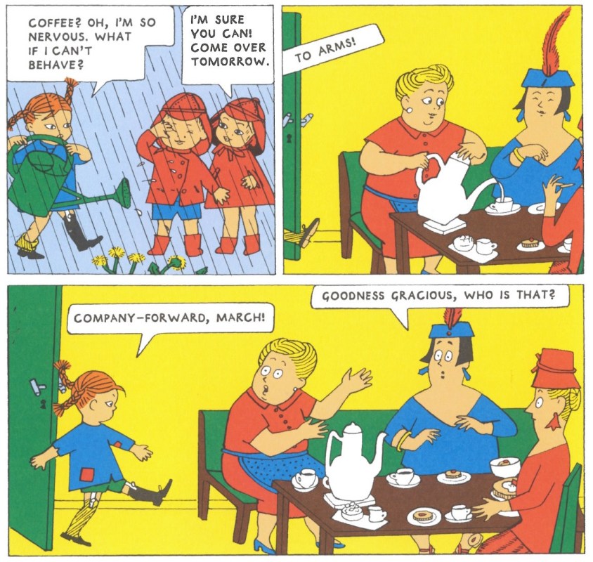 Pippi is Invited for Coffee has fun with speech bubbles; one stockinged foot and an advance salvo of ‘To Arms!’ pushing its way into frame announces the menace young Ephraim’s Daughter is about to inflict on another coffee party.