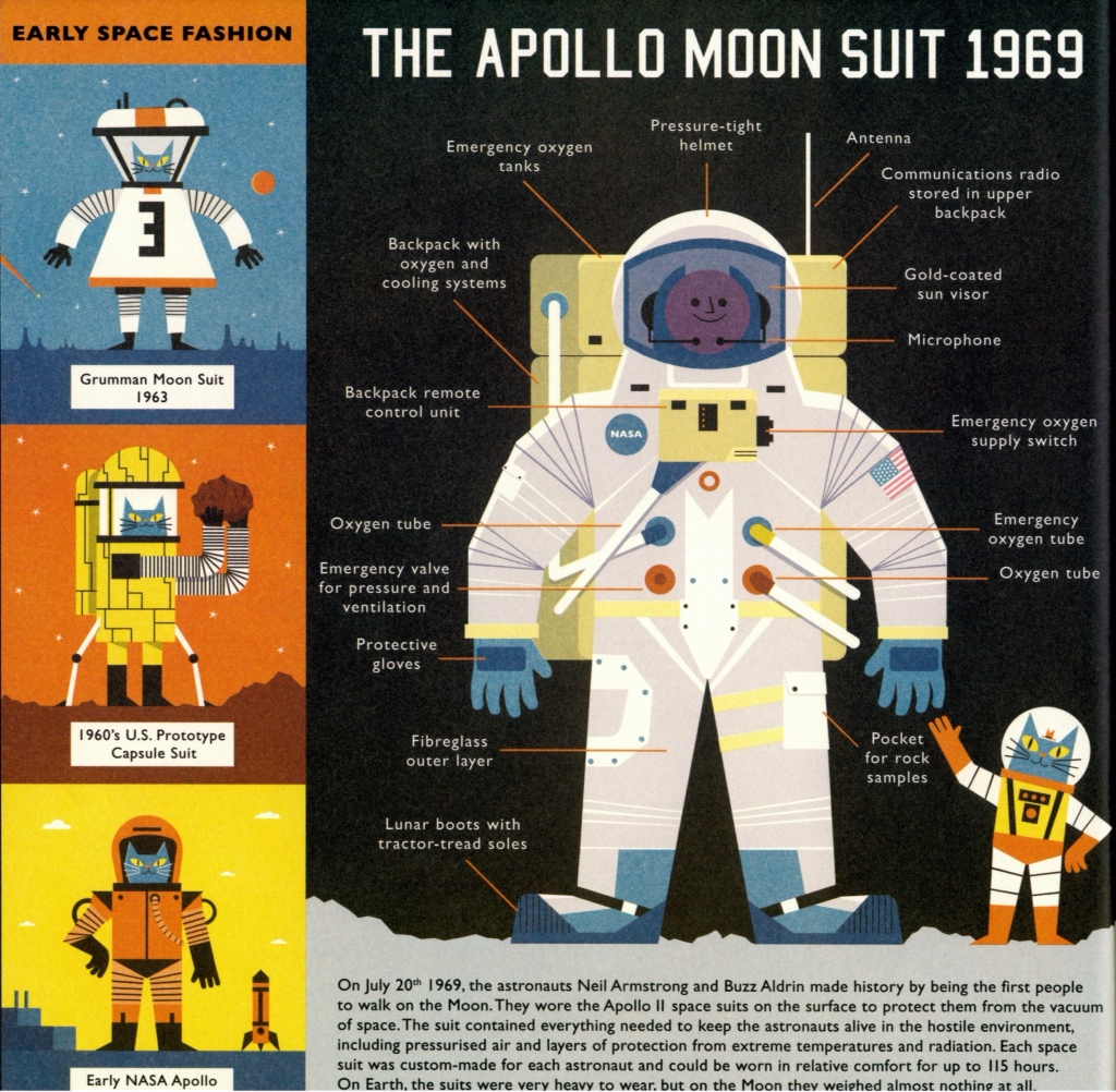 The section on the Apollo moon missions is also a treat, the vast pages allowing the authors the opportunity to cover the mission in huge detail. As well as the history, we get a damn good explanation as to how rockets actually work and a parade of early space suit fashion.