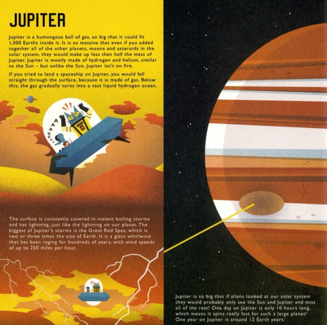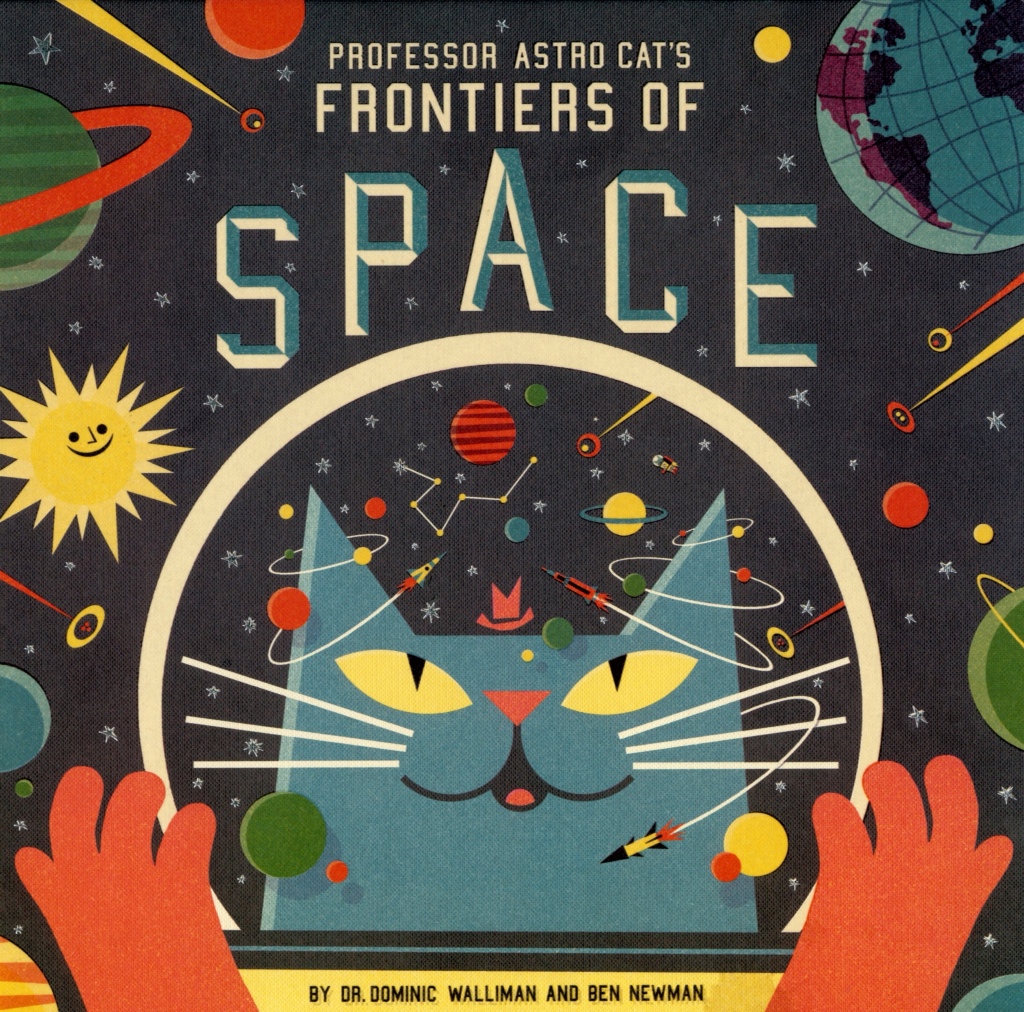 Professor Astro Cat's Frontiers of Space, from hip children's imprint Flying Eye, is a monolith sized space primer in the style of an animated US schools information film from the 1950s. It's the product of a partnership between illustrator Ben Newman and physicist Dr. Dominic Walliman. They've created a tiny-trilby wearing cat who delivers a lecture taking us from the big bang, through our solar system, diving into gas planets, plunging down wormholes and supermassive blackholes.
