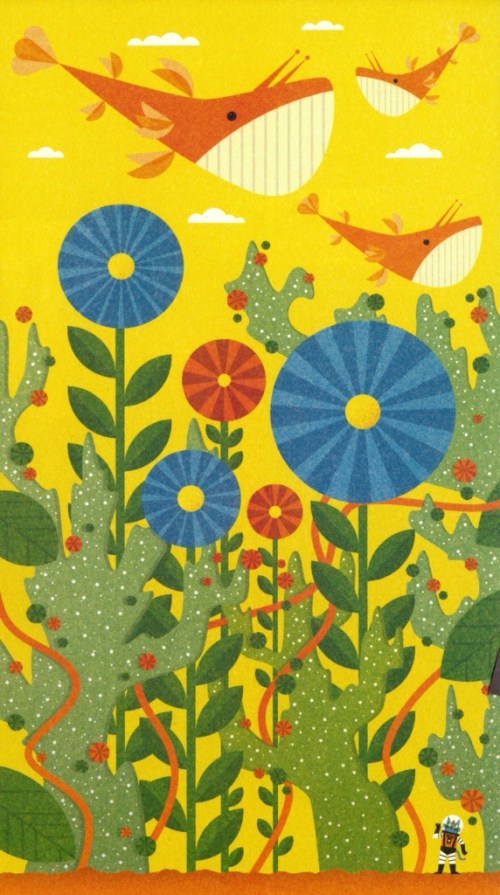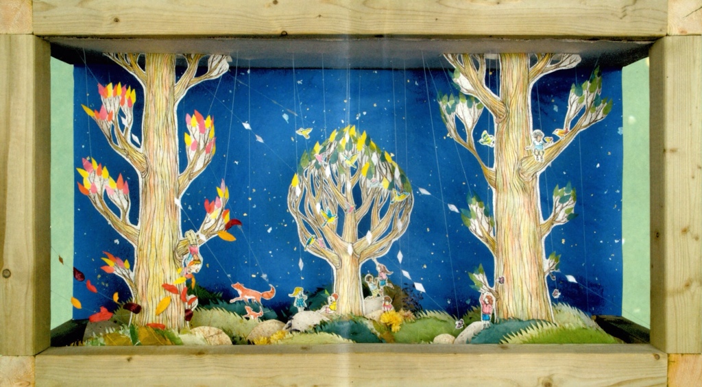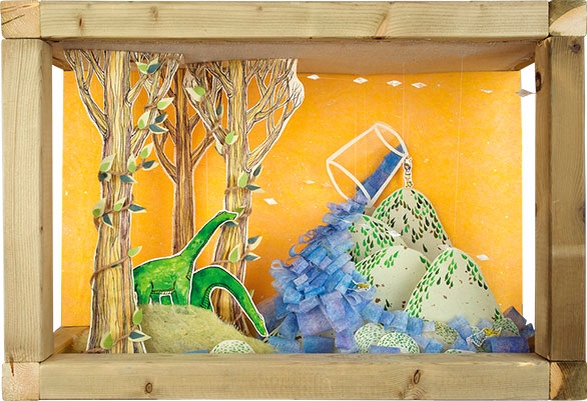 The illustrations are details taken from a set of dioramas created by mixing illustrated cut outs set agains rich, layered backdrops made from vibrant natural materials. As Kim explains, 'I used a special Japanese paper for the backgrounds in all the dioramas. It was full of little fibres from plants and also had lots of tiny gold and silver flakes. It's a lot like stardust.'