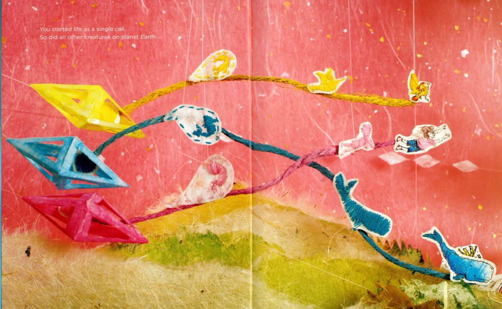 We begin with that mind-blowing fact 'Every tiny atom in your body came from a star that exploded long before you were born.' The first diorama shows a paper star splintering into dozens of chinese lanterns filled with the humans, whales and birds they will give birth to. Kim takes the star out of its hard, cold space and fills it with earthy colour, and warm organic materials. 'I used stitching to show how things grow. At first, each single cell, or egg, is fully stitched. But as the creature grows up, it also grows out of its stitches.'