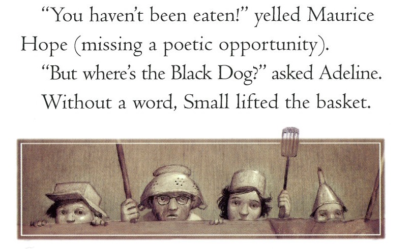 The only member of the family not to be spooked is the youngest daughter, Small (‘for short’). She gets suited and booted and heads out into the snow to face the beast, leading it with a song down to the local park and back again. Her fearlessness has the opposite effect, reducing the black dog to the size of a plate.