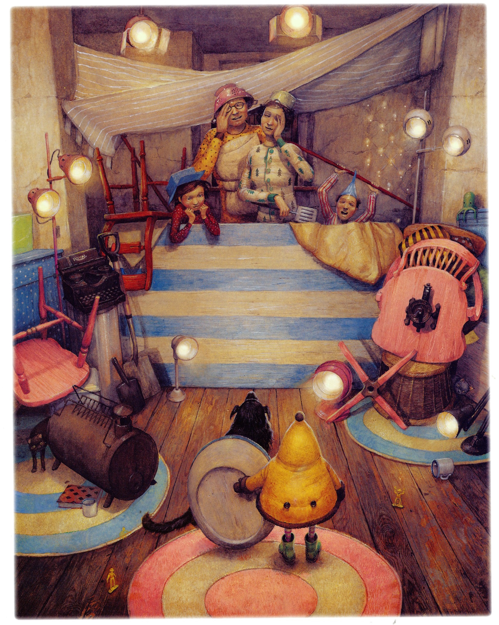 Shaun Tan is another influence, something that’s particularly evident in the cast of toys who inhabit practically every available surface of the house. The inanimate objects are full of life, and are equally affected by the dog’s arrival. Action figures, owls and Lego men run around the house, their arms in waving the air in abject terror.