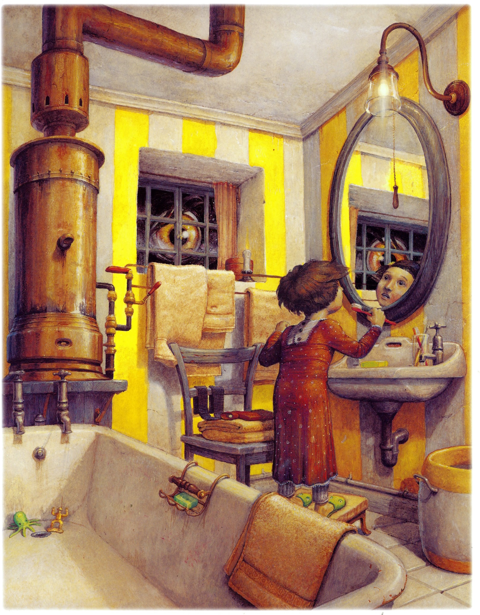 Levi Pinfold uses the picture book format to excellent effect, the page layout mirroring the shifting scenes. The main interiors of the house appear in portrait on the right hand page, with the story unfolding on the left, illustrated by some sepia toned details.