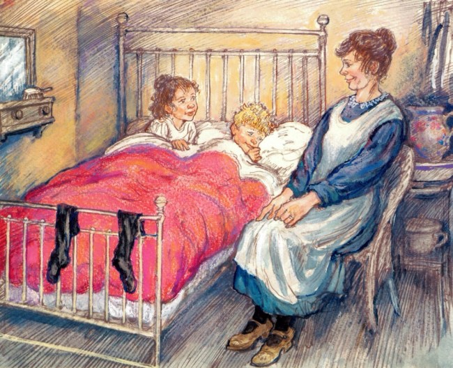 It’s the backstreets and not her own middle class household that we visit in The Christmas Eve Ghost. Bronwen and Dylan are the children of a widowed washerwoman, who works so hard she must leave the children alone while she drops and collects her laundry. This is a world stripped of the trappings of Christmas as we know it, the only festive dazzle found on the street.