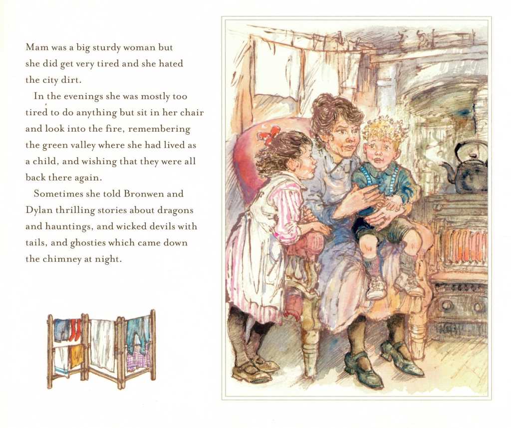 It’s the backstreets and not her own middle class household that we visit in The Christmas Eve Ghost. Bronwen and Dylan are the children of a widowed washerwoman, who works so hard she must leave the children alone while she drops and collects her laundry. This is a world stripped of the trappings of Christmas as we know it, the only festive dazzle found on the street.