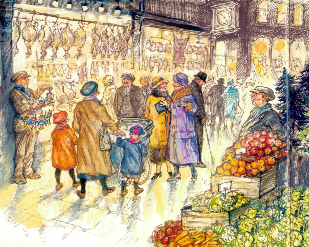 On the way home they saw the brightly-lit up shops with dead rabbits and turkeys and joints of meat hanging up, and people selling toys in the street and piles of apples on market barrows.