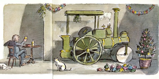 I particularly love the spread showing the steamroller at home, huffing and puffing away while his driver struggles to sleep in the bedroom above. It reminded me of being a child, getting up in the small hours and sneaking downstairs in near darkness that had the quality of black and white movies. The Christmas tree would be unlit, but I was kept warm by the embers in the fireplace as I sureptitiously peeled open the thinly wrapped corners of my best looking presents.