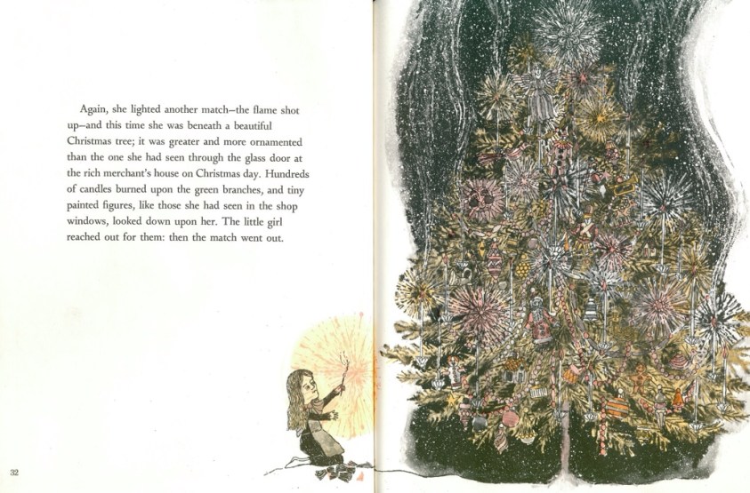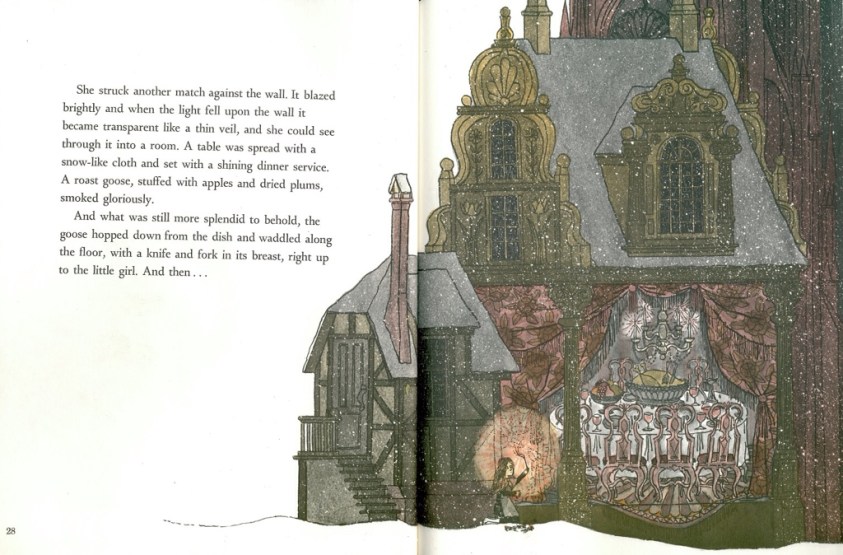 Barefoot she struggles on until she collapses against the wall of a great house. To keep warm she strikes the matches. One by one they reveal the luxuries within – a boiler, plump goose and laden Christmas tree. These are her final, tantalising moments. d