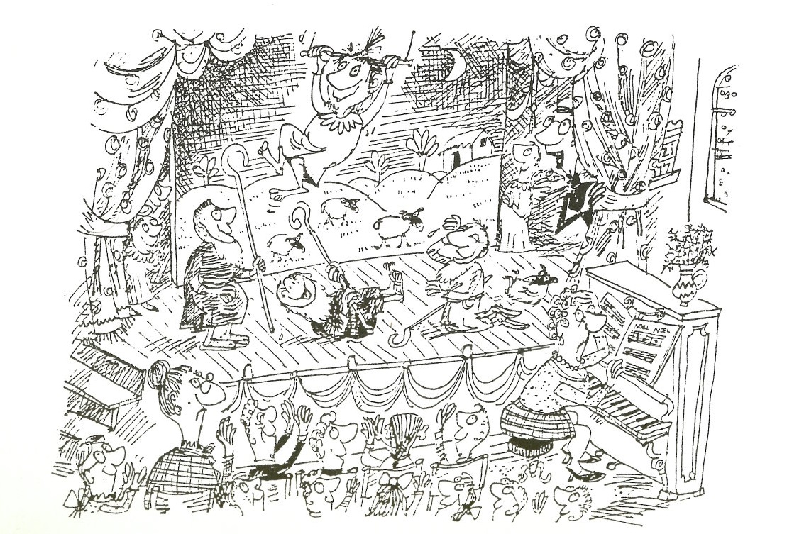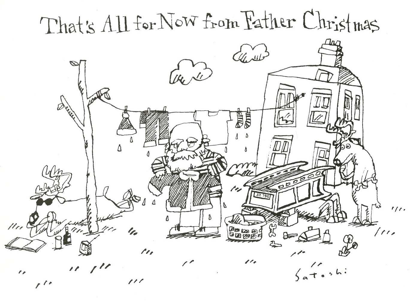 The Happy Christmas Book is mostly illustrated by Satoshi Kitamura, the genius behind books like Angry Arthur and Igor. He described his approach recently, 'I'd rather aim for something funny and happy than be gloomy. I've never done a story without humour'. My favourite type of children's writer then.
